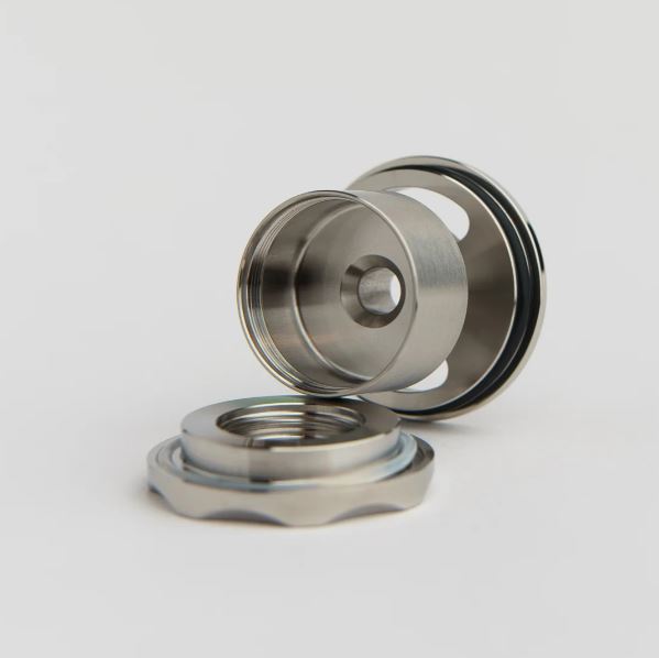La campana del Diplomat MTL RTA originariamente preinstallata, ora rilasciata nella versione nano con ricarica dall´alto. Campana a forma piatta con un enorme smusso conico attorno al foro del camino.